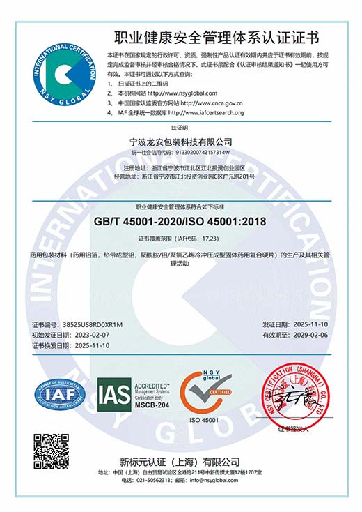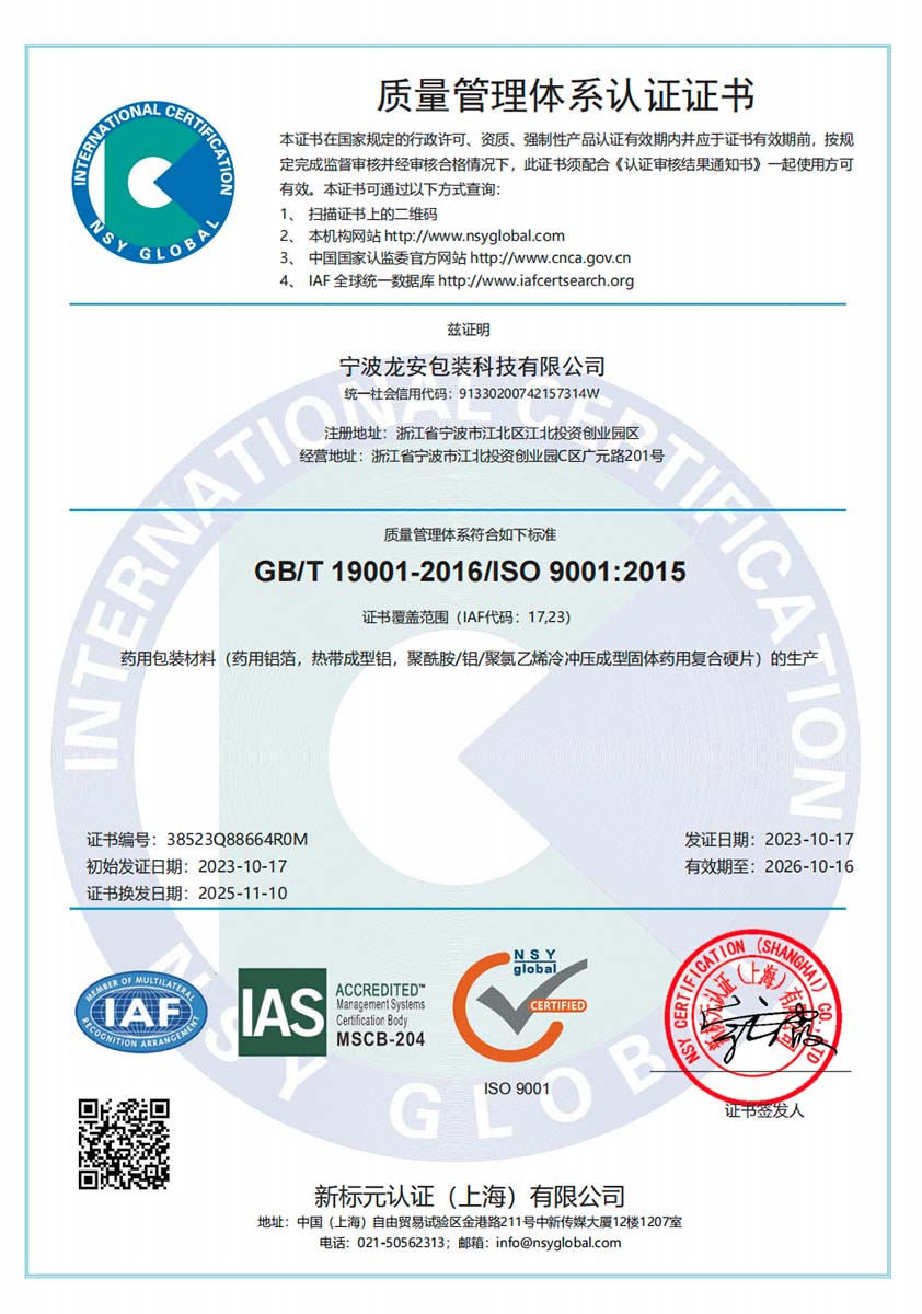 - · 宁波龙安是ISO9001、ISO15378认证的公司